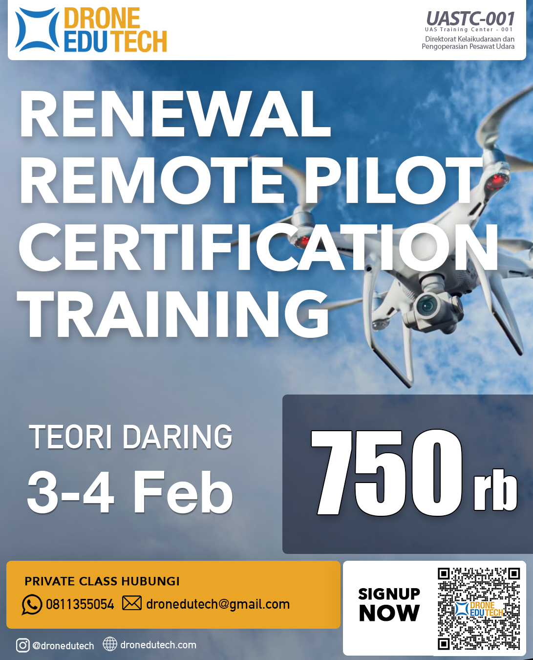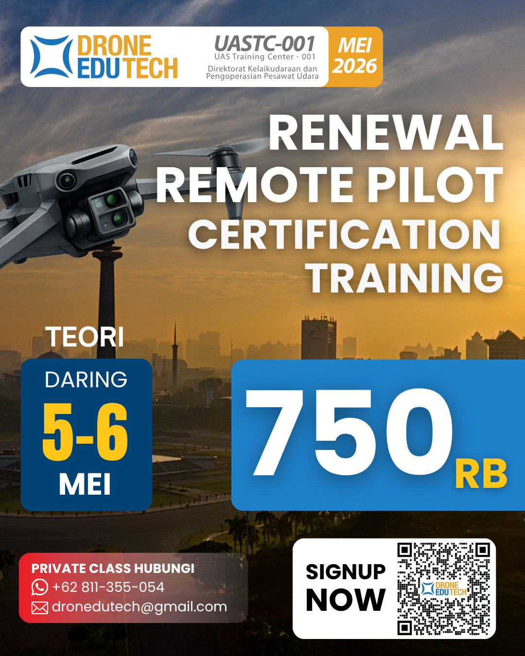 Kami mengundang Alumni Drone Edutech untuk pembaruan Sertifikat Kompetensi Drone Edutech yang masa berlakunya sudah habis sebagai salah satu dokumen yang wajib di lampirkan untuk pengajuan Remote Pilot Certificate di website SIDOPI GO dengan cara mengikuti pelatihan Renewal Remote Pilot Certification Training.